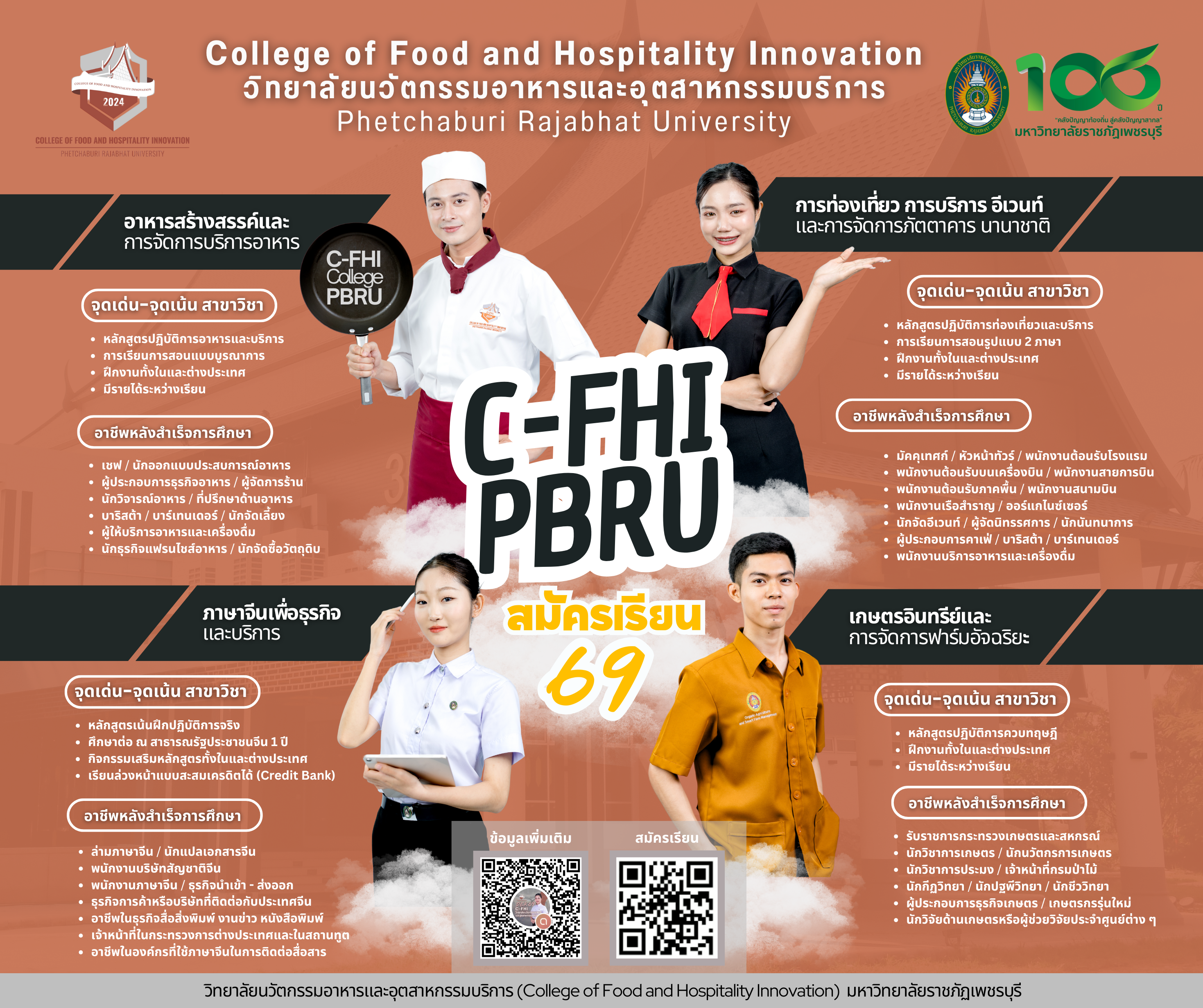 ที่วิทยาลัยนวัตกรรมอาหารและอุตสาหกรรมบริการ (PBRU College of Food and Hospitality Innovation) โดดเด่นด้วยหลักสูตรที่ถูกออกแบบมาให้ทันสมัย รองรับการเรียนรู้ในรูปแบบต่าง ๆ ทุกช่วงวัย